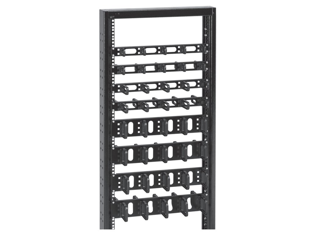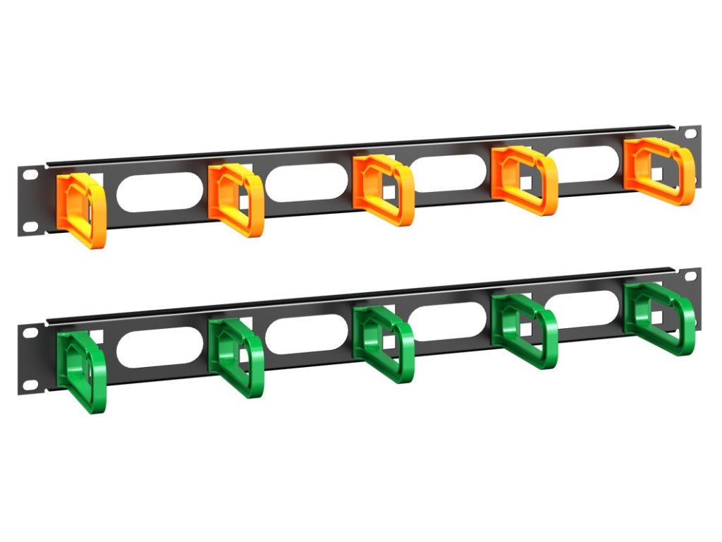 Vyväzovacie panely s plastovými okami sú používané na uloženie a horizontálne vedenie káblov v rozvádzači.