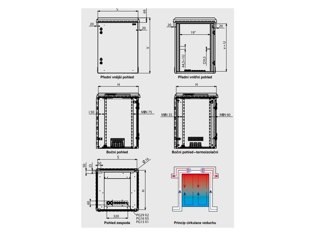 Veľkosti podľa IEC 60297, vzduchotesnosť a ochrana proti kontakte s cudzími látkami a vode v súlade s STN EN 61587-1/6.4 IEC60529. Ohňovzdorná, nehorľavá, epoxy polyesterová elektrostatická prášková farba RAL7035 pre najvyššiu odolnosť proti korózii.
