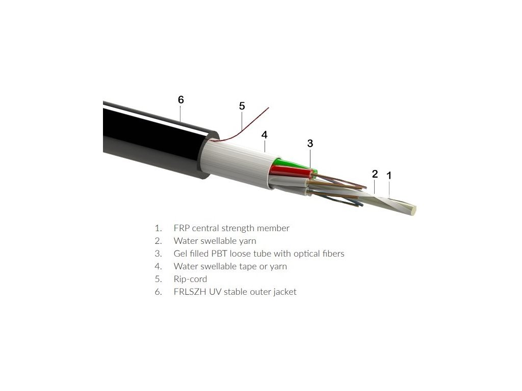 Vlákna sú uložené v centrálnej trubičke plnené gélom, vďaka čomu sú chránené pred vniknutím vody. Optický kábel neobsahuje žiadne kovové prvky a je plne dielektrický. Samotné vlákno je typu G.657A1 necitlivé na ohyby tzv. BIMMF s minimálnym polomerom ohybu 7,5 mm.