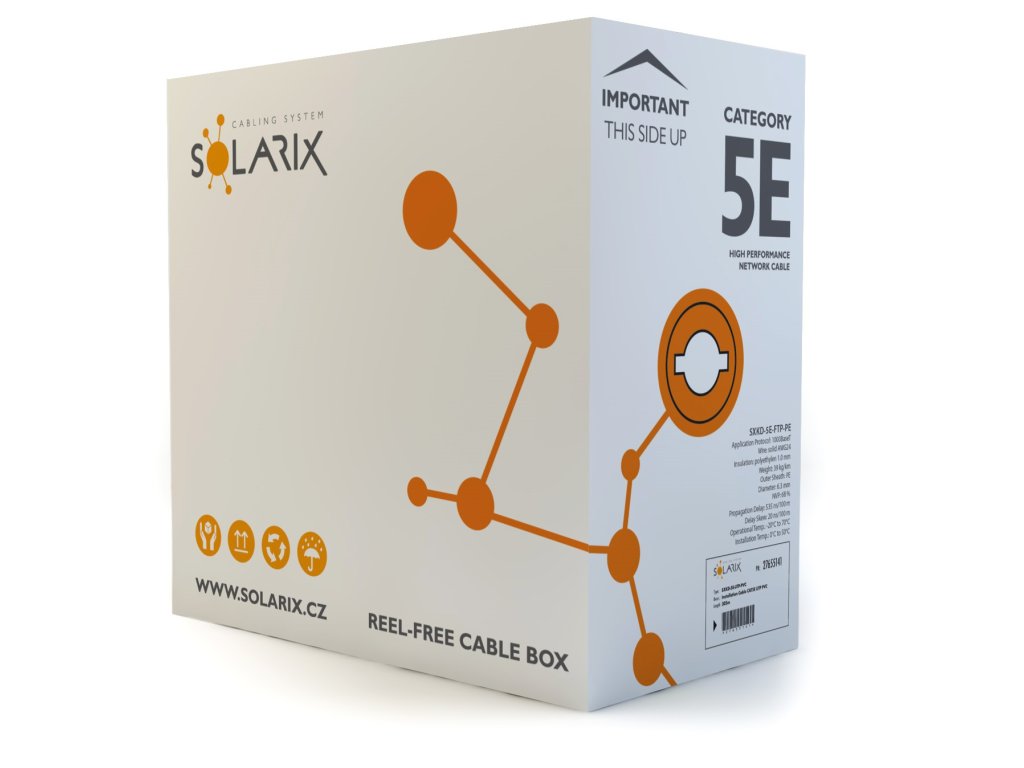 Tieto káble bez problémov spĺňajú požiadavky definované v medzinárodných štandardoch ANSI/TIA/EIA568, ISO/IEC11801 a EN50173 pre kategóriu 5E a sú vhodné aj pre prenos dát rýchlosťou až 1 Gb/s (tj. Gigabitový Ethernet). Rovnako ako ostatné káble Solarix, je aj kábel SXKD-5E-FTP-PE značený metráží po 1m v rozsahu od 0 do 305m.