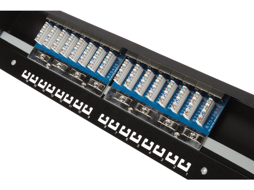 Tienené patch panely Solarix - kategórie 5E sú osadené moduly s duálnou IDC svorkovnicou 110 / Krone. Svorkovnica je z dôvodu ľahkého zakončenia kábla označená podľa štandardu T568A aj T568B, a to za pomoci farieb párov a číselného označenia jednotlivých vodičov priamo na doske plošných spojov (nepárne číslo označuje vždy polobarevný vodič a párne plne farebný). Súčasťou tela panelu je vyvazovacie lišta, ktorá slúži k prehľadnému usporiadaniu a pevnému uchyteniu dátového kábla a tiež uzemňovací vodič, ktorý spoľahlivo prepojí tienenie kabeláže sa uzemnením v rozvádzači.
