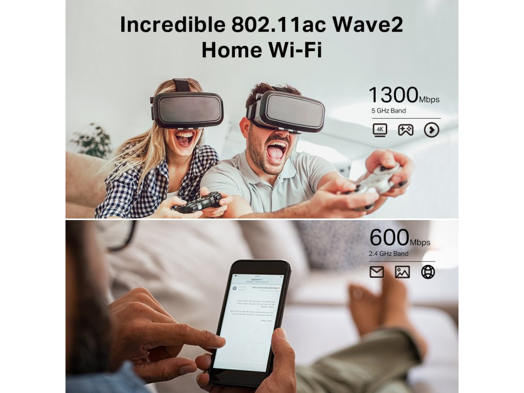 - Rýchlosť až 1300 Mbps v pásme 5 GHz a 600 Mbps v pásme 2,4 GHz