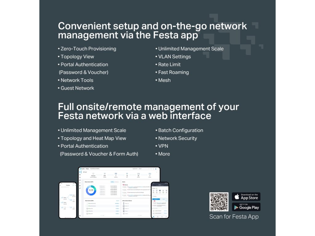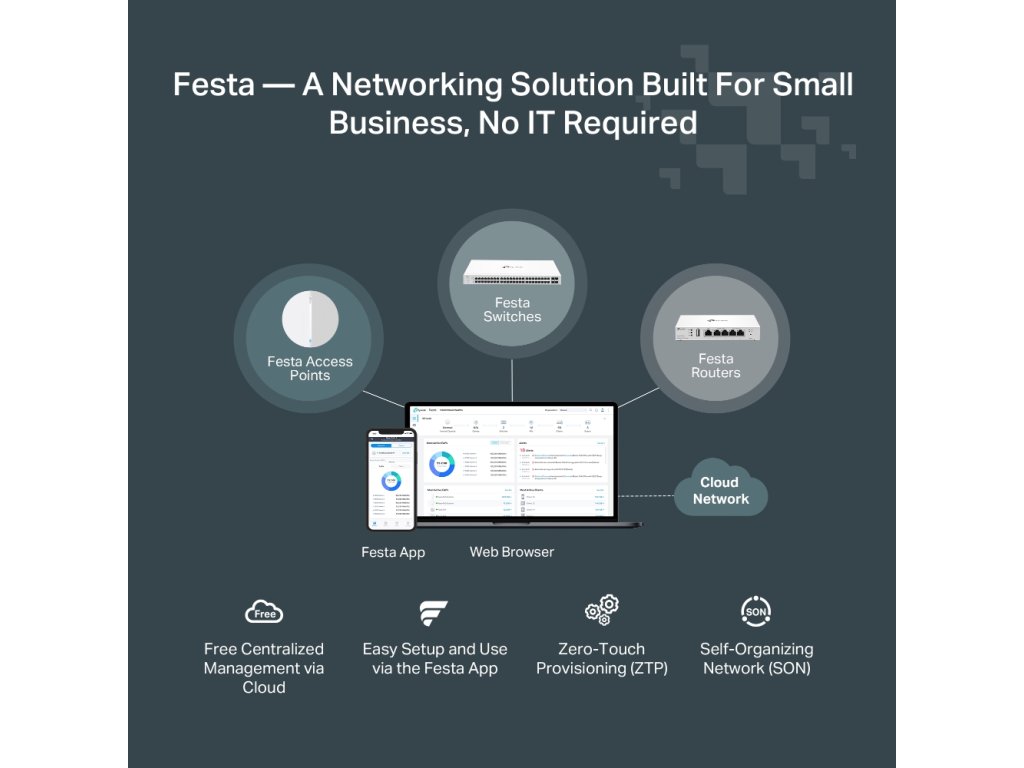 Festa ponúka funkcie na úrovni podnikov s jednoduchosťou zameranou na spotrebiteľov. TP-LINK má bezplatné cloudové centralizované riadenie, ktoré je prístupné prostredníctvom aplikácie Festa alebo webu, poskytujúce základné funkcie pre malé podniky bez zložitosti vyžadovanej pre operácie väčšieho rozsahu.