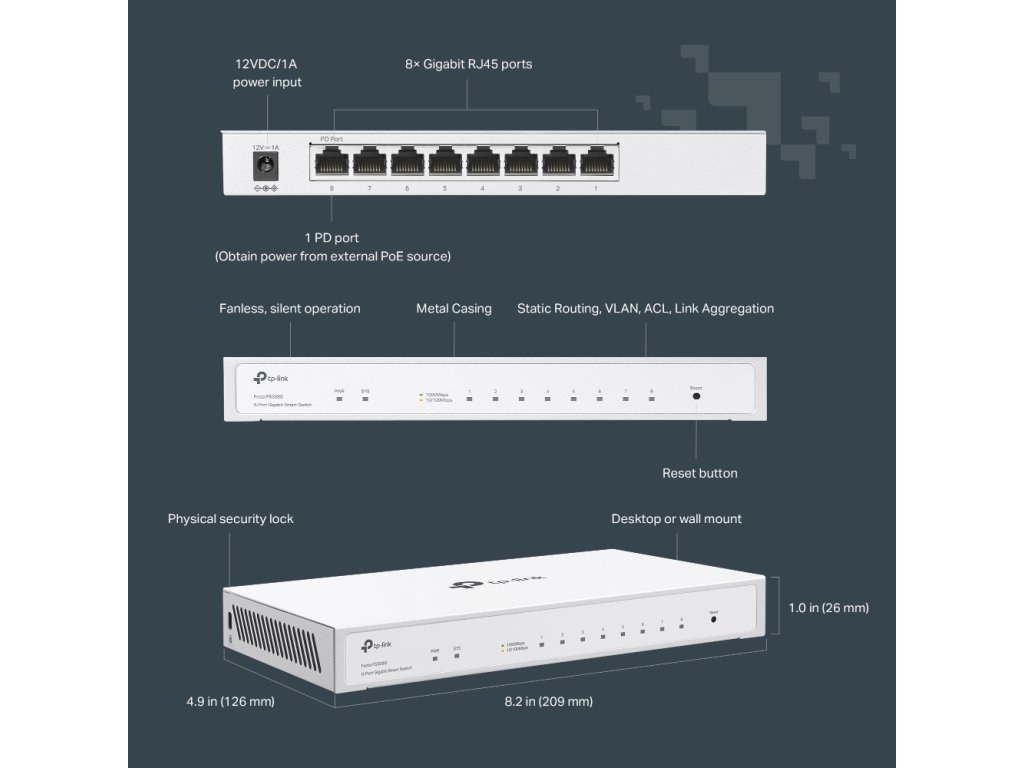- 8× gigabitových portov (port 8 podporuje vstup PoE)