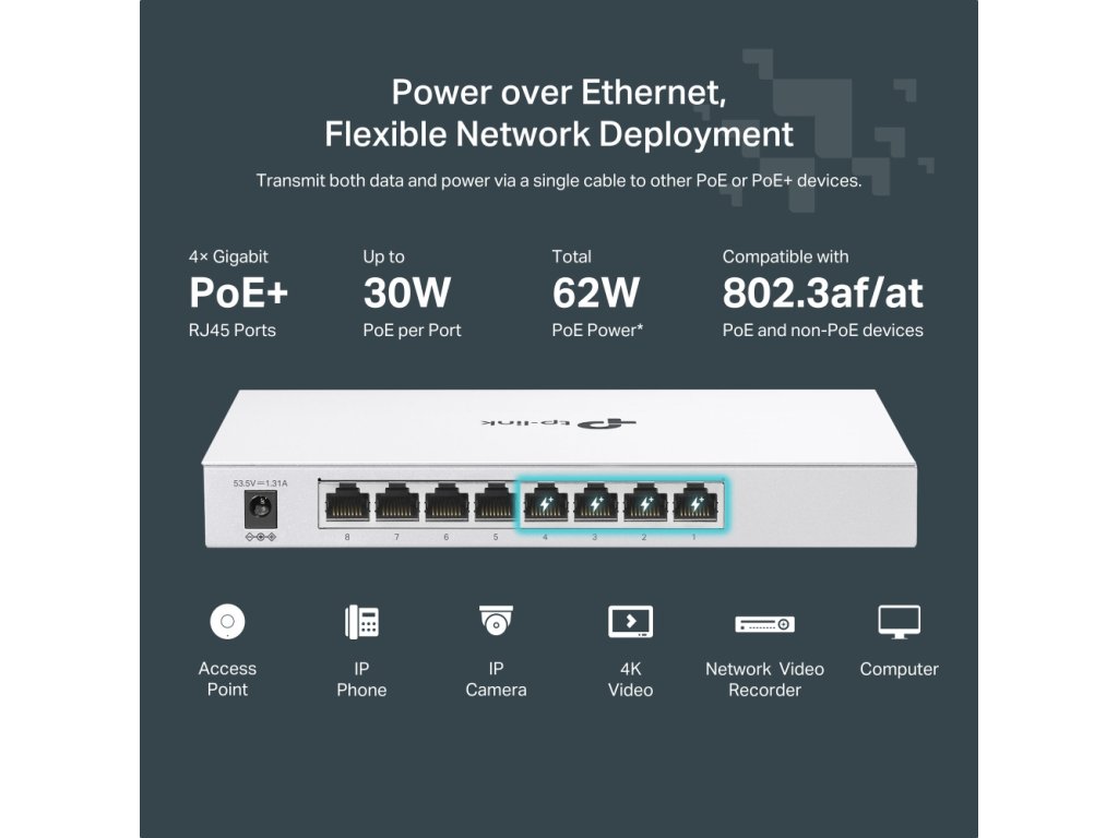 - 8× Gigabit portov (4× PoE+ porty podporujúce štandard 802.3at/af)