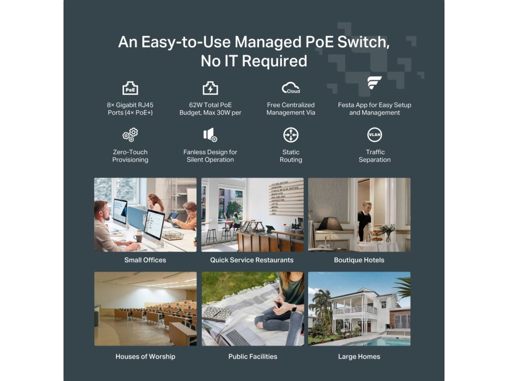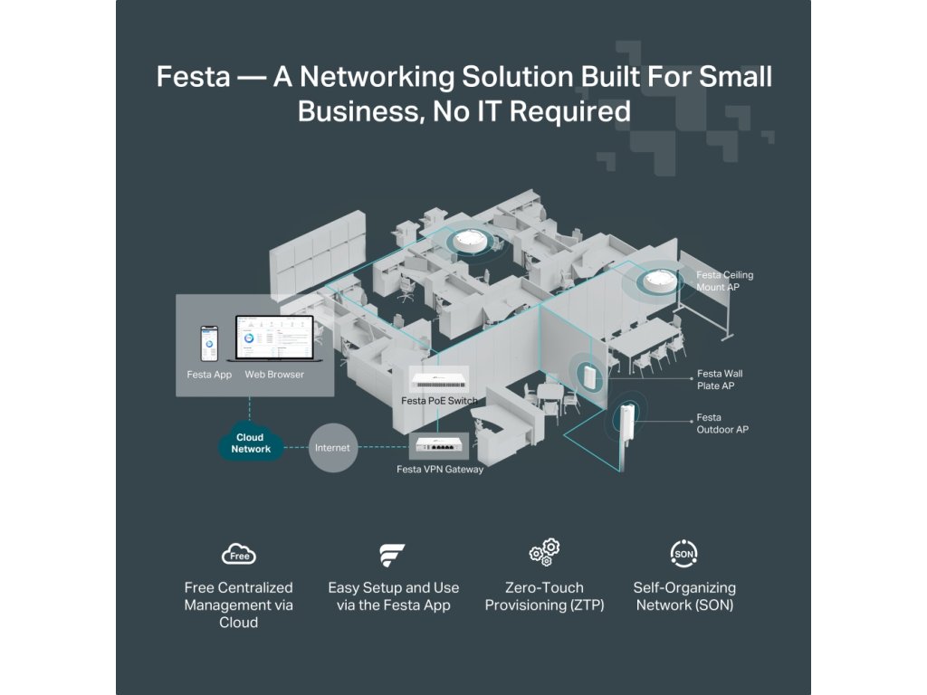 Festa ponúka funkcie na úrovni podnikov s jednoduchosťou zameranou na spotrebiteľov. TP-LINK má bezplatné cloudové centralizované riadenie, ktoré je prístupné prostredníctvom aplikácie Festa alebo webu, poskytujúce základné funkcie pre malé podniky bez zložitosti vyžadovanej pre operácie väčšieho rozsahu.