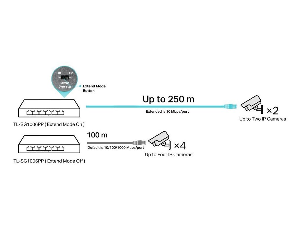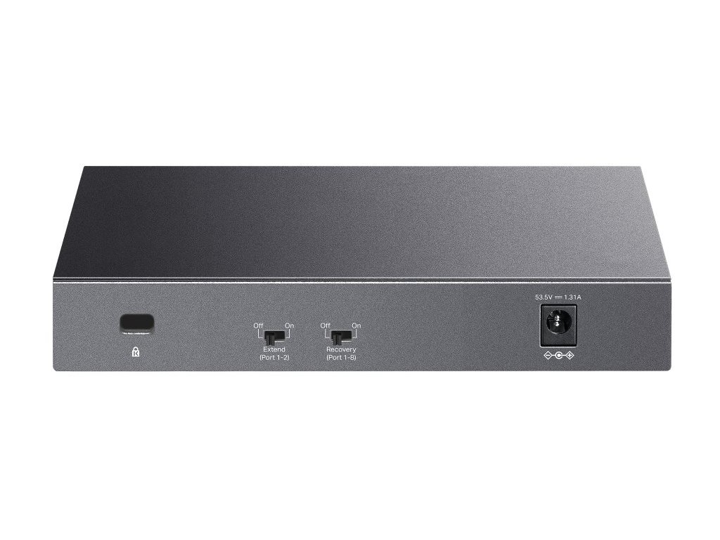Switche umožňuje aj PoE na vzdialenosť 250m (porty 1-2) pri prepnutí špeciálneho prepínača, ktorý spôsobí poníženie linkovej rýchlosti na PoE portoch na 10 Mbps, čo pre prenos obrazu z kamier bohato stačí. Ďalším bonusom switcha je prepínač pre PoE Auto Recovery (porty 1-8) zaisťujúce automatické reštartovanie napájania pre prvky, ktoré prestanú komunikovať.
