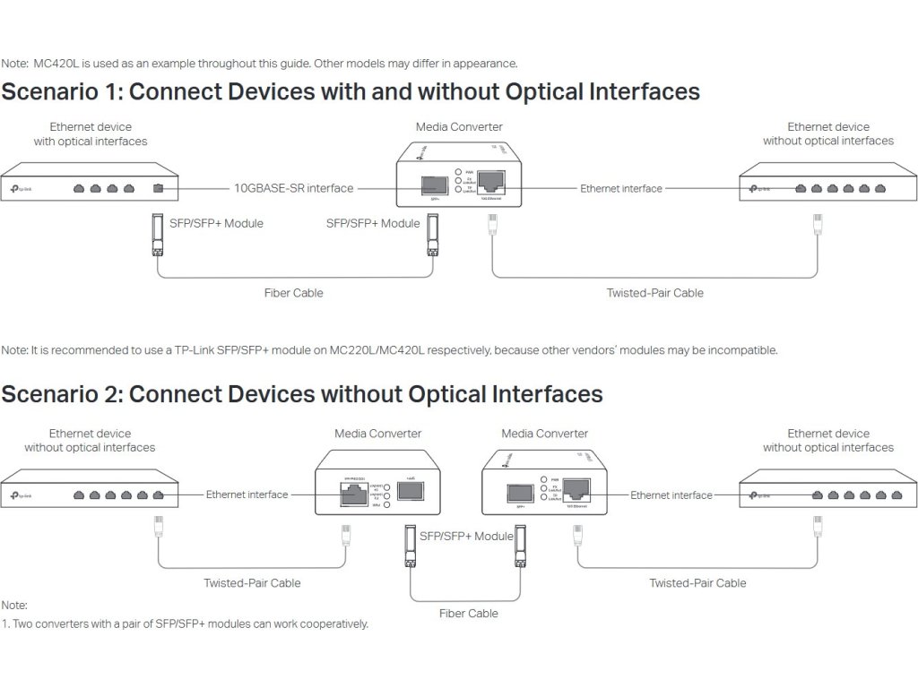 Metalicko-optický mediakonvertor s rýchlosťou až 10 Gbps je ideálnym riešením pre transformáciu signálu medzi optickým vláknom a metalickým káblom. optického modulu), stôl alebo integráciu do šasi TP-Link MC1400.
