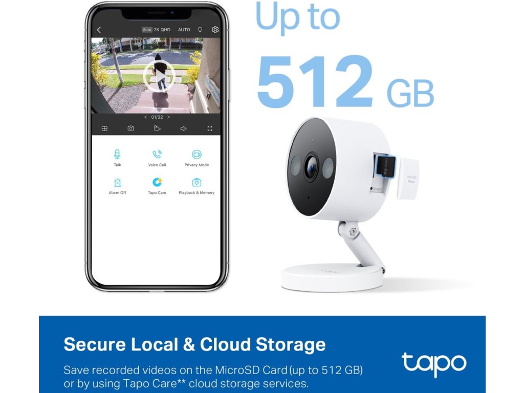 - Zabezpečené lokálne a cloudové úložisko - Majte až 512 GB záznamu nepretržite uloženého na karte microSD (predáva sa samostatne) alebo si vyberte našu predplatenú službu Tapo Care Cloud, ktorá nielen ukladá 30-dňovú históriu videozáznamov, ale poskytuje aj ďalšie výhody, ako sú oznámenia o činnostiach.
