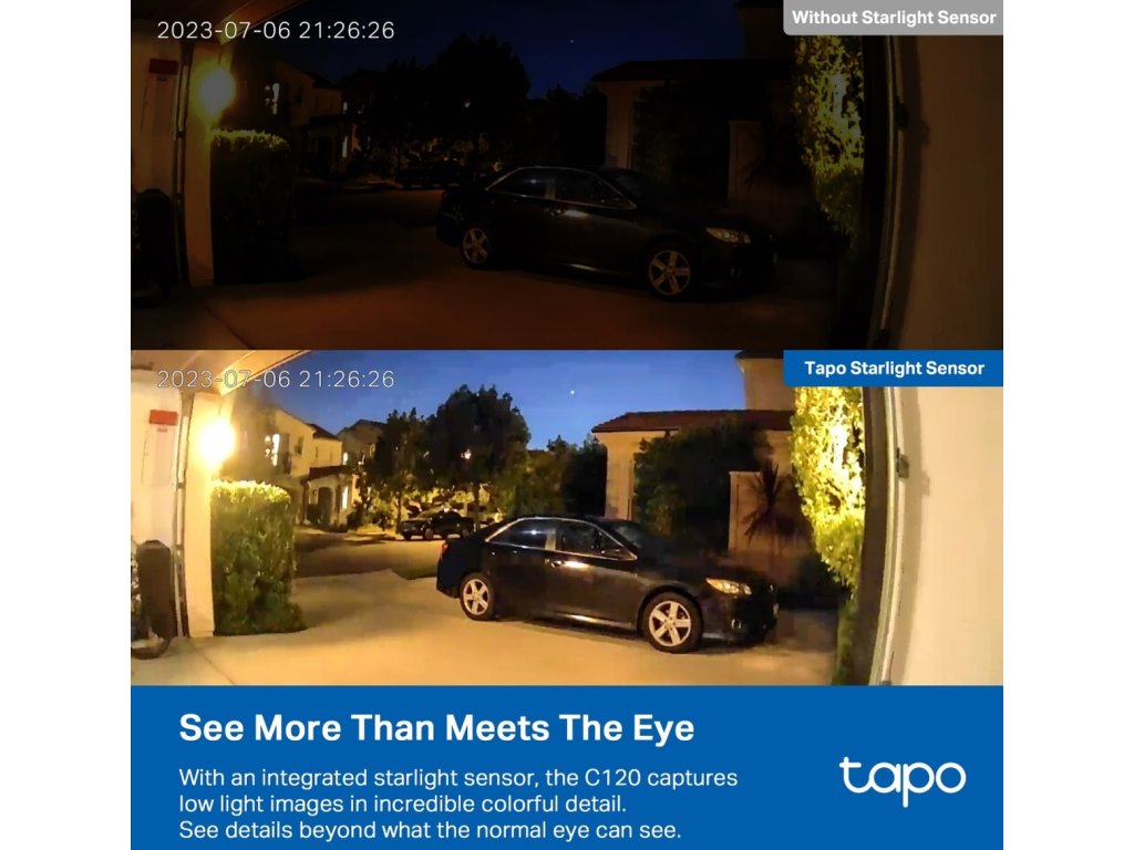 - Vstavané duálne reflektory - S duálnymi reflektormi Tapo C120 preniknete tmou a slabým osvetlením a získate lepší zážitok zo sledovania v noci, pričom sa stále zobrazuje v plných farbách.
