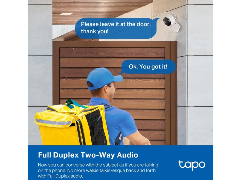 - Plne duplexný obojsmerný zvuk - Počúvajte a hovorte s hosťami, vodičmi dodávok a domácimi miláčikmi na druhej strane kamery s lepšou čistotou vďaka špičkovému mikrofónu a reproduktorom kamery Tapo C120.