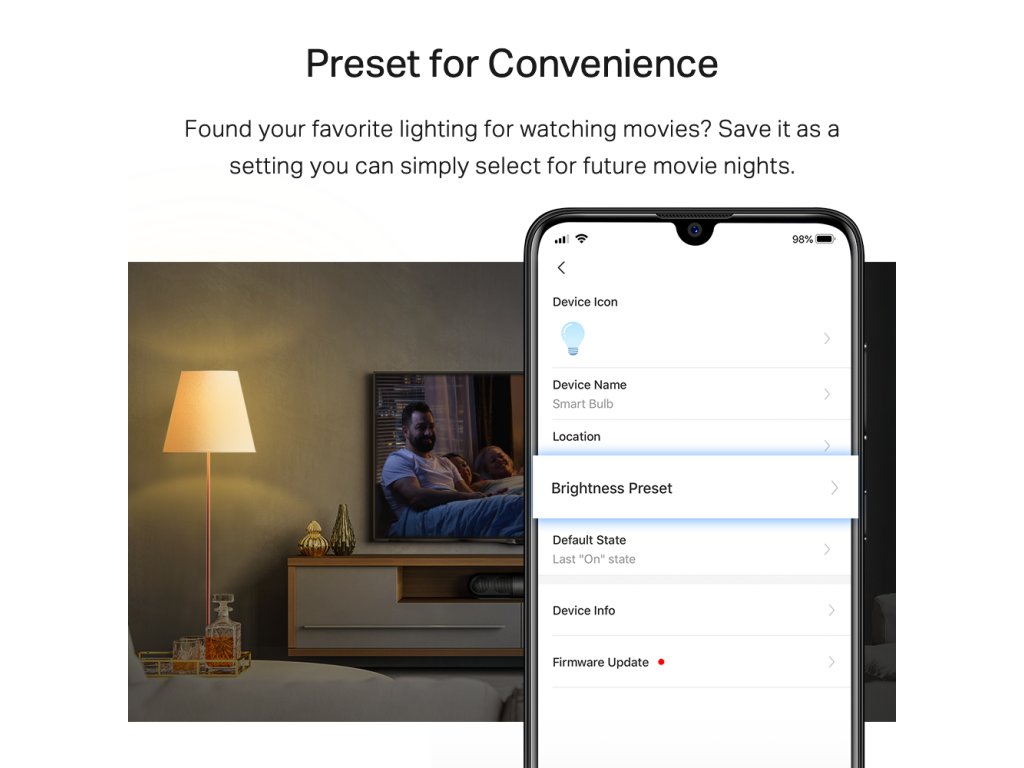 - Stmievateľná (nastavenie pre vaše pohodlie) - Našli ste svoje obľúbené osvetlenia pre sledovanie filmov? Uložte ho ako nastavenie, ktoré si môžete jednoducho vybrať pre budúce filmové noci