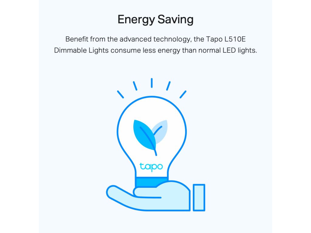 LED žiarovka TP-LINK Tapo L510E, Smart WiFi žiarovka sa hodí na použitie v akomkoľvek svetle s päticou E27 a napätím s hodnotou 230 V. Určite vás rozradostí, že sa táto LED žiarovka môže pochváliť triedou energie A+, ktorá garantuje nemalé úspory v porovnaní s klasickými žiarovkami. Nesmieme zabudnúť spomenúť príkon LED žiarovky 8,7W a životnosť dostatočných 15000h, čo je naozaj veľa.