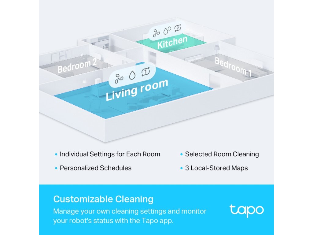 - Nastavenie špecifického režimu upratovania pre každú miestnosť.