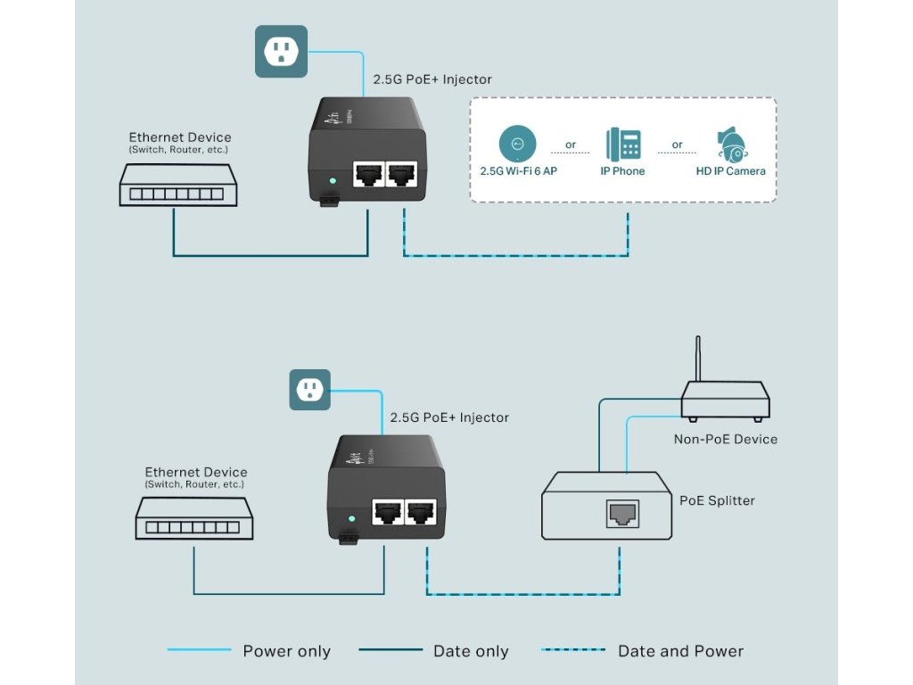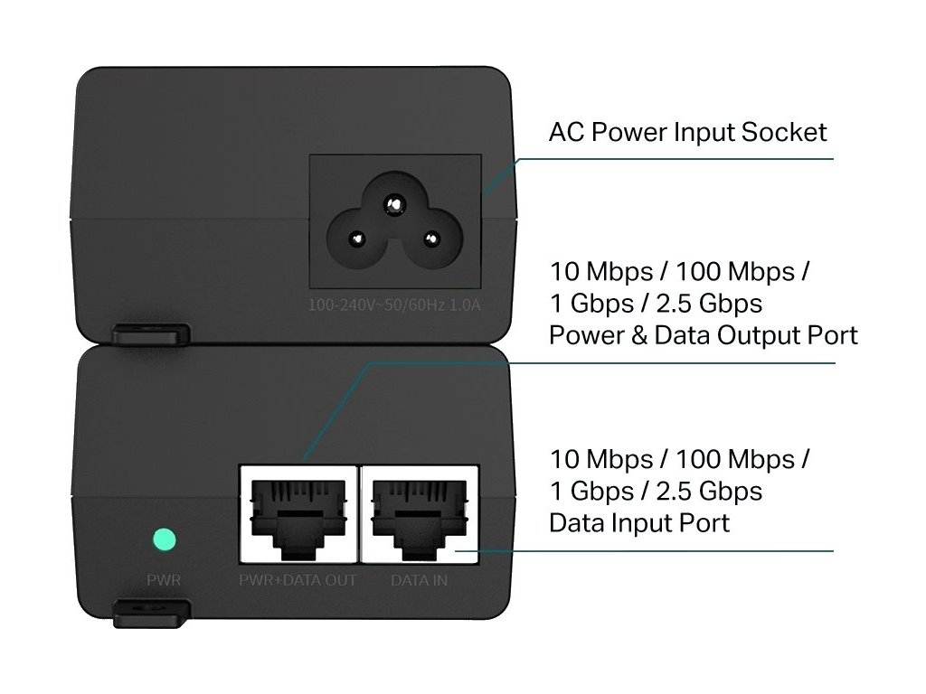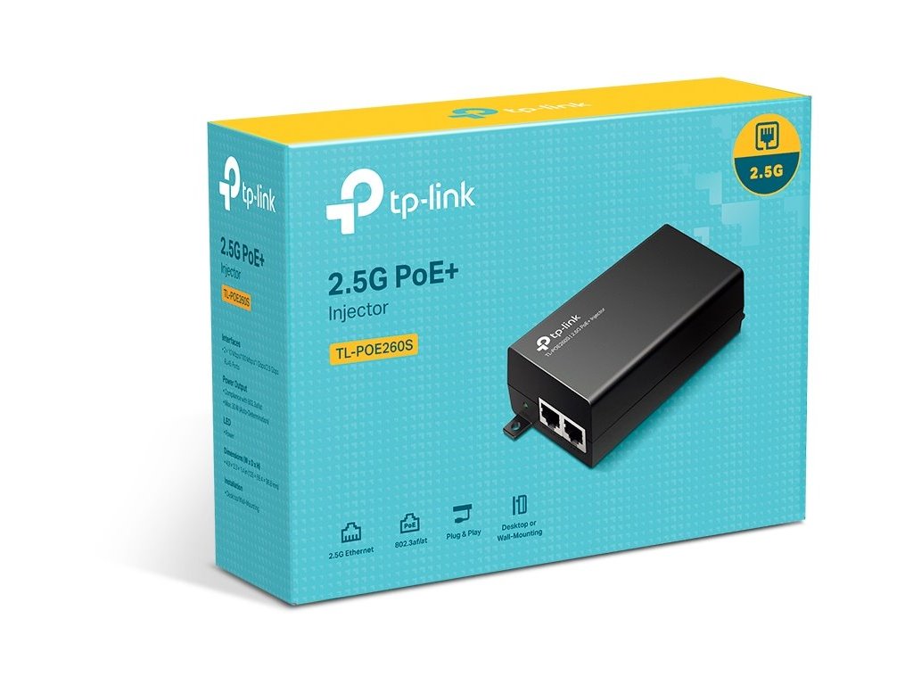 TL-POE260S je veľmi robustný a kvalitný 2.5 Gigabitový napájací PoE injektor, ktorý podporuje 802.3af/at štandardy s výkonom až 30W, čo je vhodné riešenie pre napájanie zariadení s veľkým dátovým tokom ako sú Wi-Fi 6/6E Access Pointy.