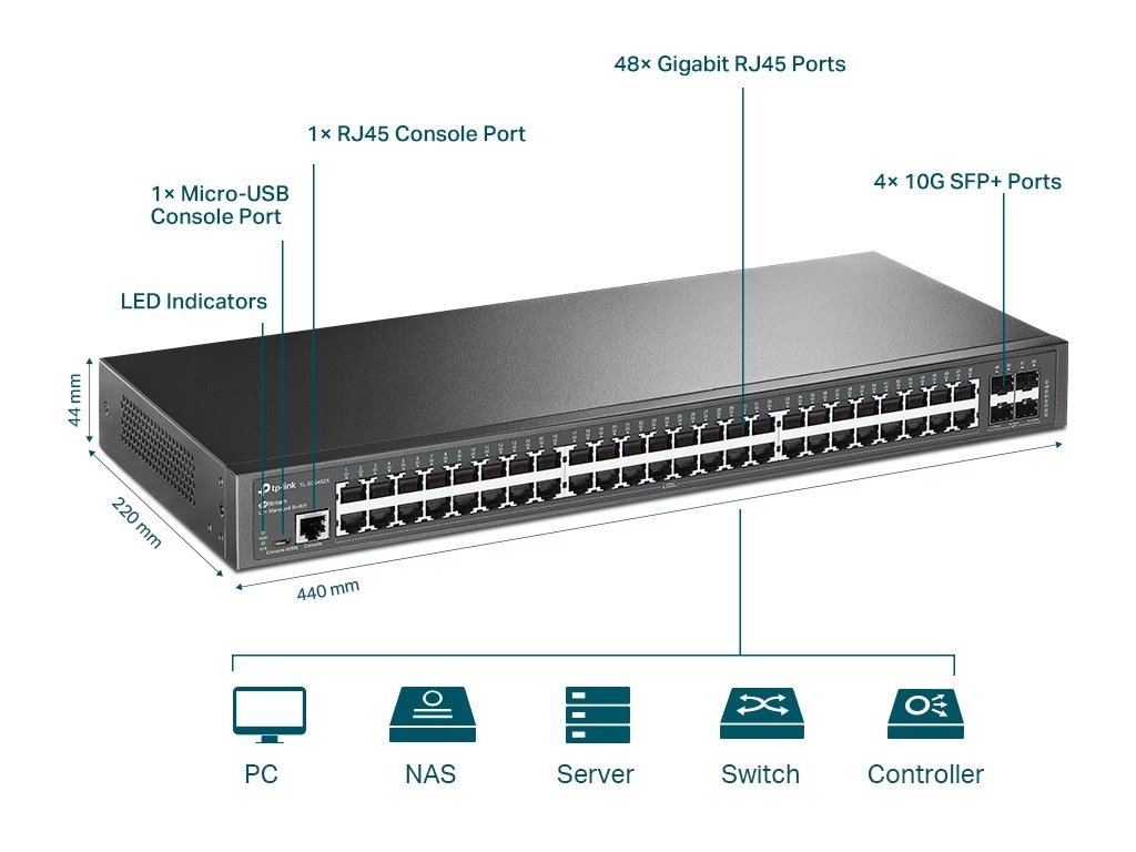 TL-SG3452X poskytuje 48x 10/100/1000Mbit/s LAN portov. Navyše sú k dispozícii aj štyri 10G SFP+ sloty. K správe a monitoringu je možné využiť bežný prístup cez webové rozhranie a protokoly napr. CLI, SNMP, RMO, ale aj centralizovaný cloud manažment a softvérový controler. Podporovaný je aj hardvérový controller Omada (OC200/OC300).