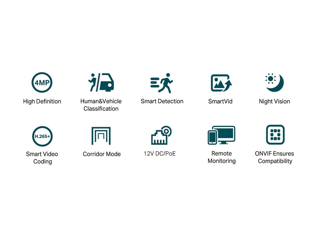 VIGI C440I (4mm) je základná 4 megapixelová Turret kamera značky TP-Link určená na vnútorné použitie s fixným objektívom 2.8 mm, IR prísvitom do 30m vzdialenosti a ethernetovým portom s 802.3af PoE.